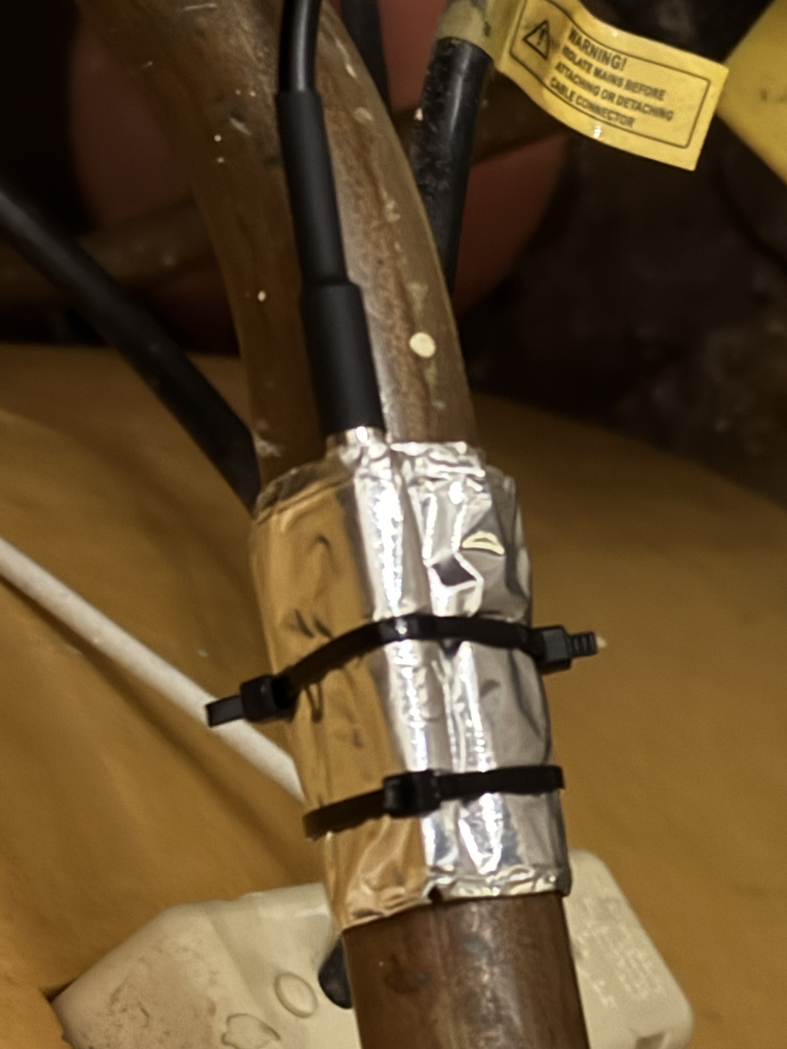 The sensors come with a metal housing on the end, and so I made a makeshift strip from kitchen aluminium foil; about an inch wide and as long as the width of the roll. I wrapped this around the pipe once, and then included the sensor housing, before wrapping the rest of the tape around. I fastened with a couple of cable ties.