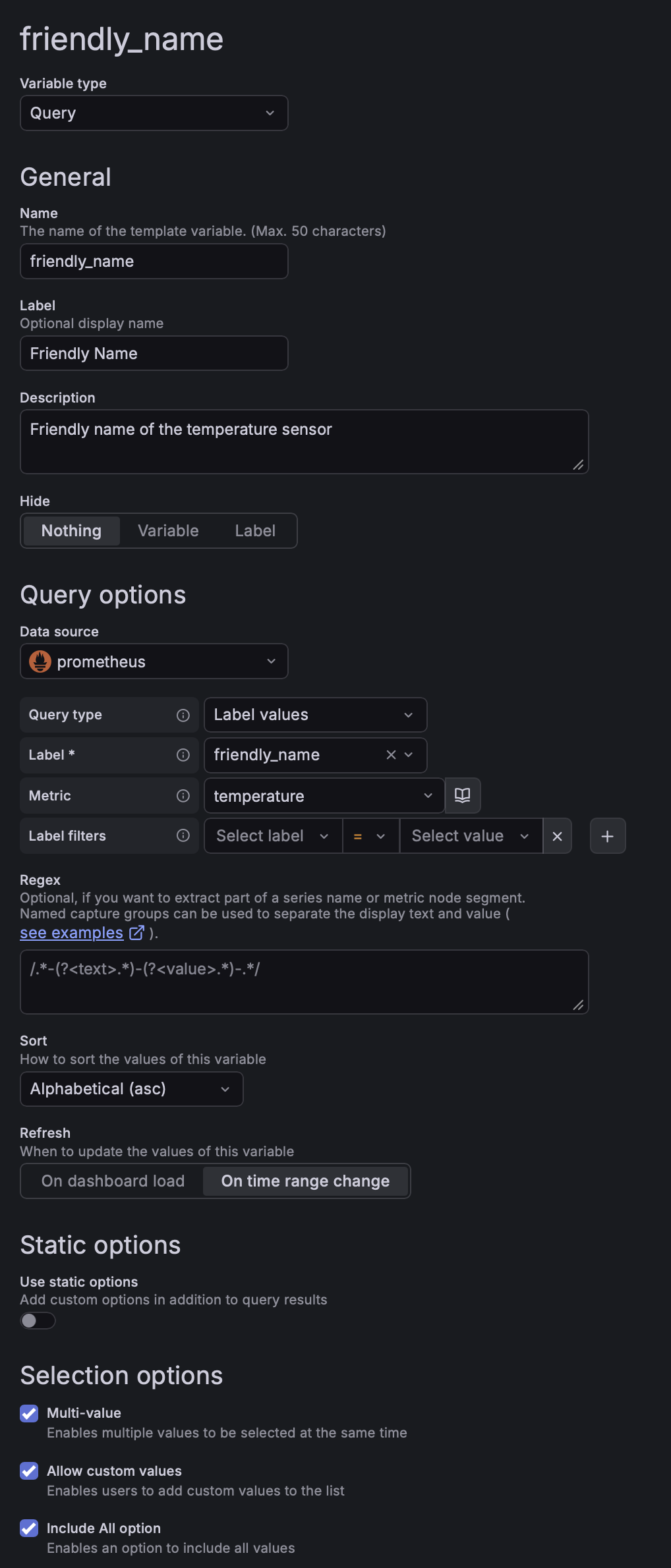 In Grafana I created a new dashboard, and a variable picker. This picker uses the friendly_name field introduced above:
