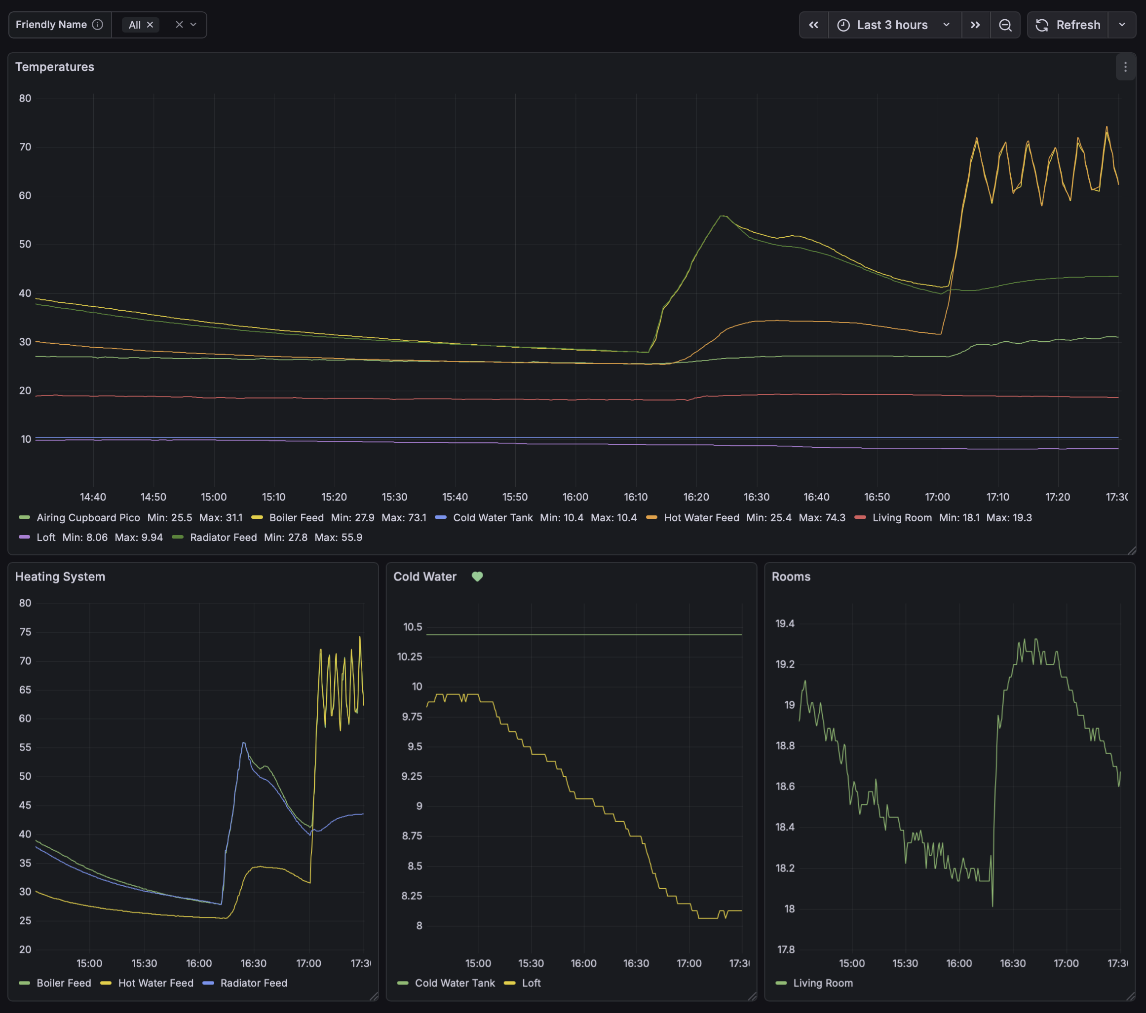 I looked at a combination of last_over_time and changes, but, particularly with the cold water tank, the temperature could be very stable (and not change in value) for hours on end.