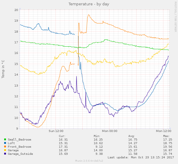 Lastly, I hacked up a munin plugin. All I needed was the munin-node package (apt-get install munin-node) as my remote munin instance would be collecting the data and producing the graphs (it's already doing things like the already mentioned temperature in the lounge, electricity usage, and more mundane things like the SNR & sync rate of my ADSL line from my router).